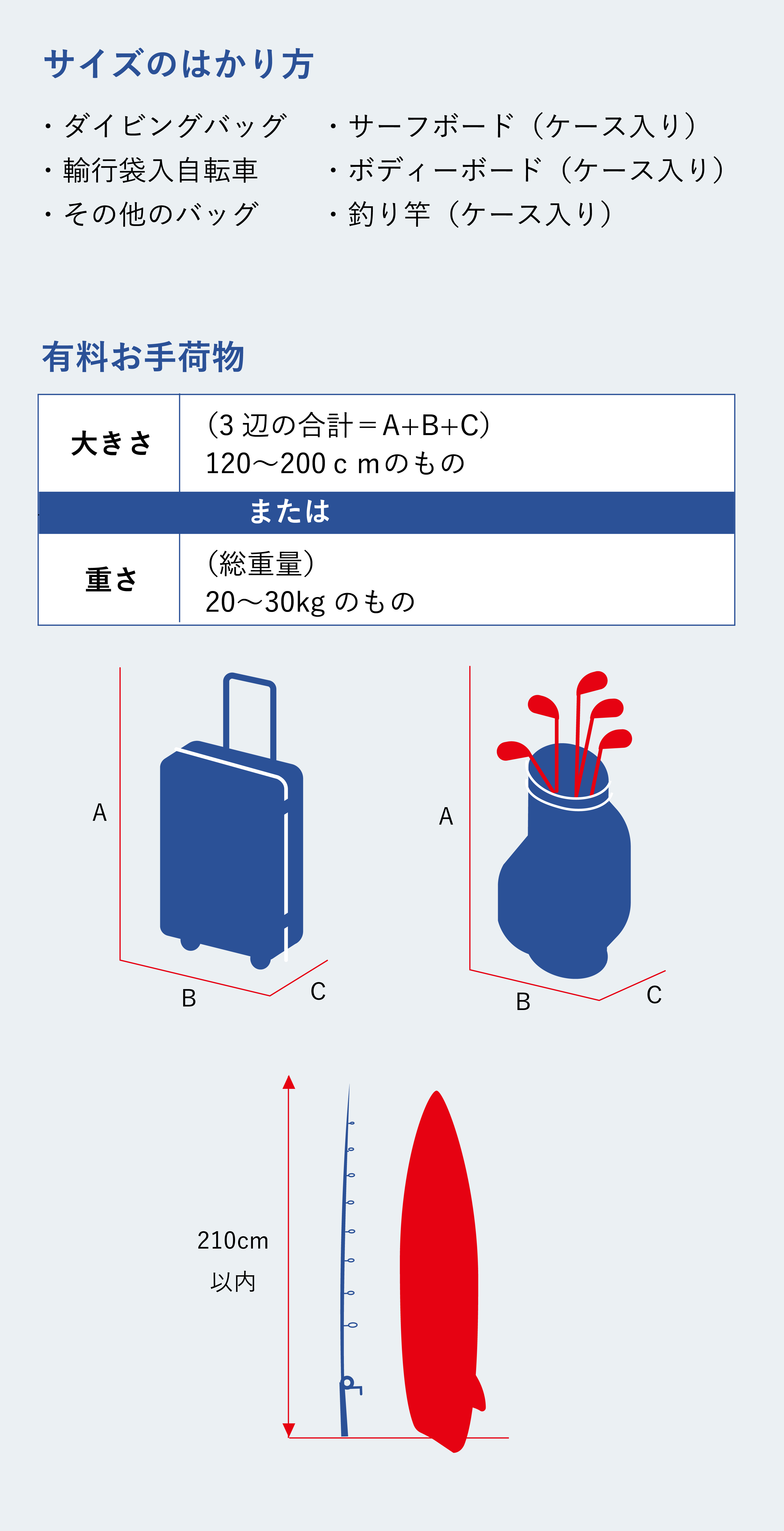 三辺の和が120cm超または、総重量20kg超のもの(2個の場合は合算した総計。但し三辺の和が200cm以下で、総重量30kgが上限)