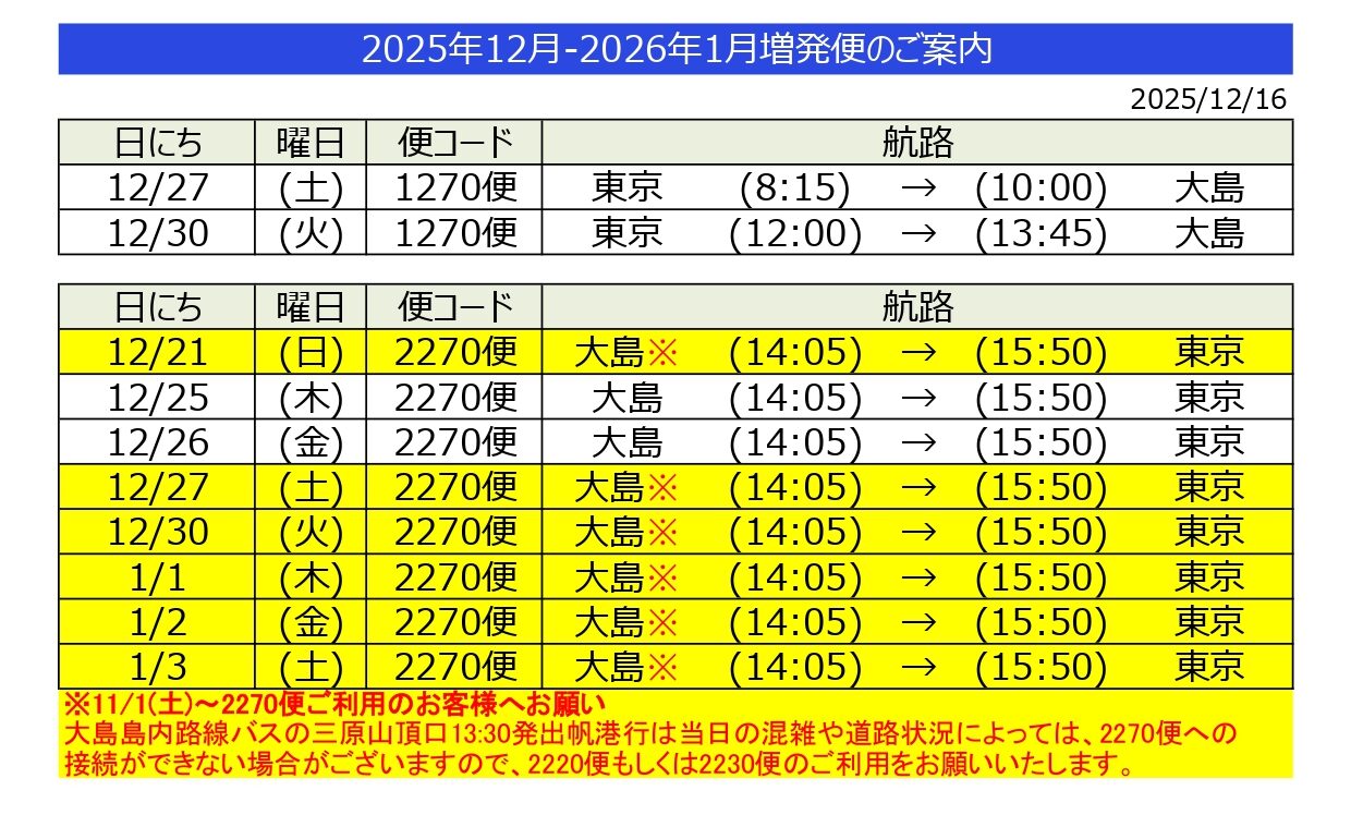 2025年12月-2026年1月 高速ジェット船 増発便のお知らせ 運航に関する情報 2025.12.16 下記の通り増発便を運航いたします。 ご予約は東海汽船お客様センター(03-5472-9999/毎日9:30~18:00)にて承ります。