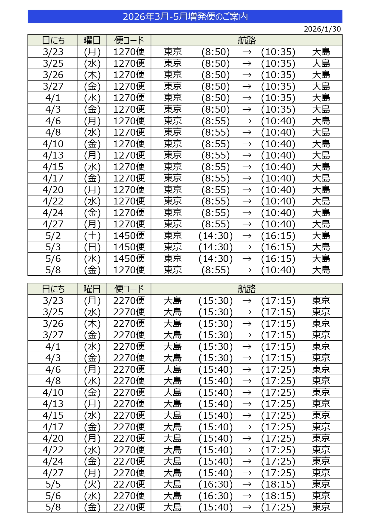 下記の通り増発便を運航いたします。