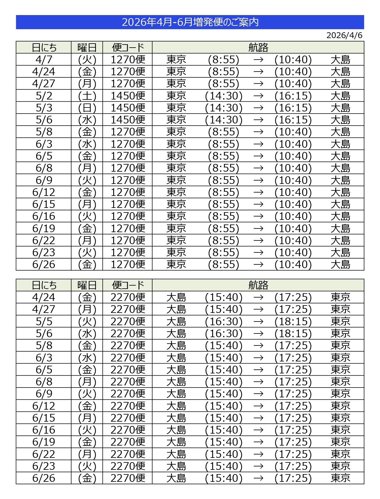 2026年4月-6月 高速ジェット船 増発便のお知らせ 運航に関する情報 2026.04.06 下記の通り増発便を運航いたします。 ご予約は東海汽船お客様センター(03-5472-9999/毎日9:30~18:00)にて承ります。