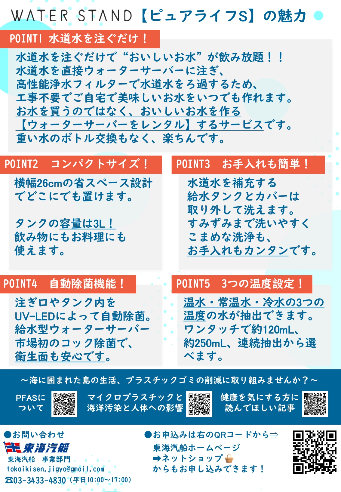 この度ウォータースタンド株式会社との特別タイアップにより、これまで離島での提供が不可能であった給水型ウォーターサーバー「ピュアライフ」のお取り扱いが可能となりました。