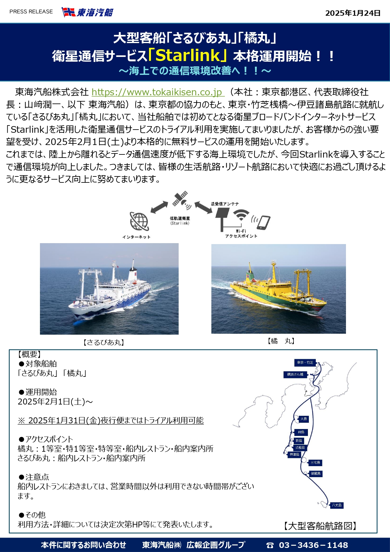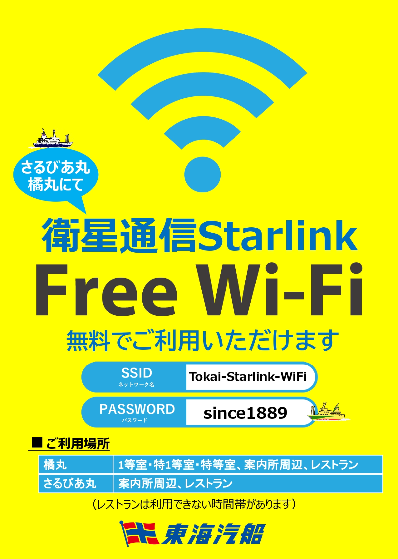 大型客船「さるびあ丸」「橘丸」衛星通信サービス「Starlink」の本格運用開始 2025.2.1~ プレスリリース 2025.01.24 アクセスポイント付近で上記ネットワーク名を選択 パスワードを入力しご利用ください。
