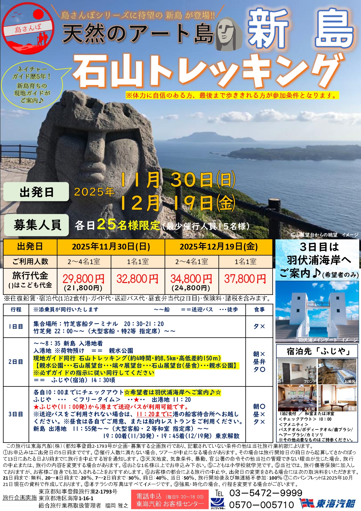 【島さんぽシリーズ第十一弾】『天然のアート島「新島」石山トレッキングツアー』(2025.11/30・12/19発)