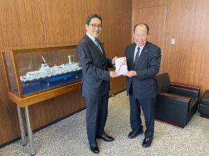 また、12月22日(月)には、出張で上京中の青ヶ島村の佐々木宏村長が当社へお越しになり、同様に目録を贈呈いたしました。