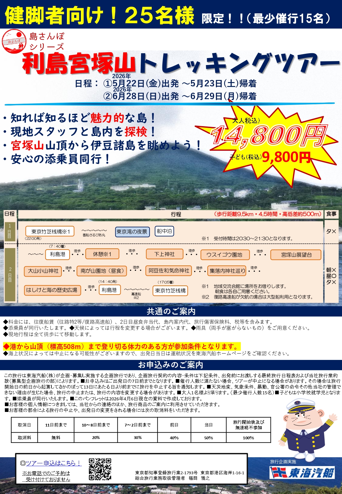 往復船賃(往路:特2等/復路:高速船)、2日目昼食弁当代、島内案内代、保険料、諸税を含みます。