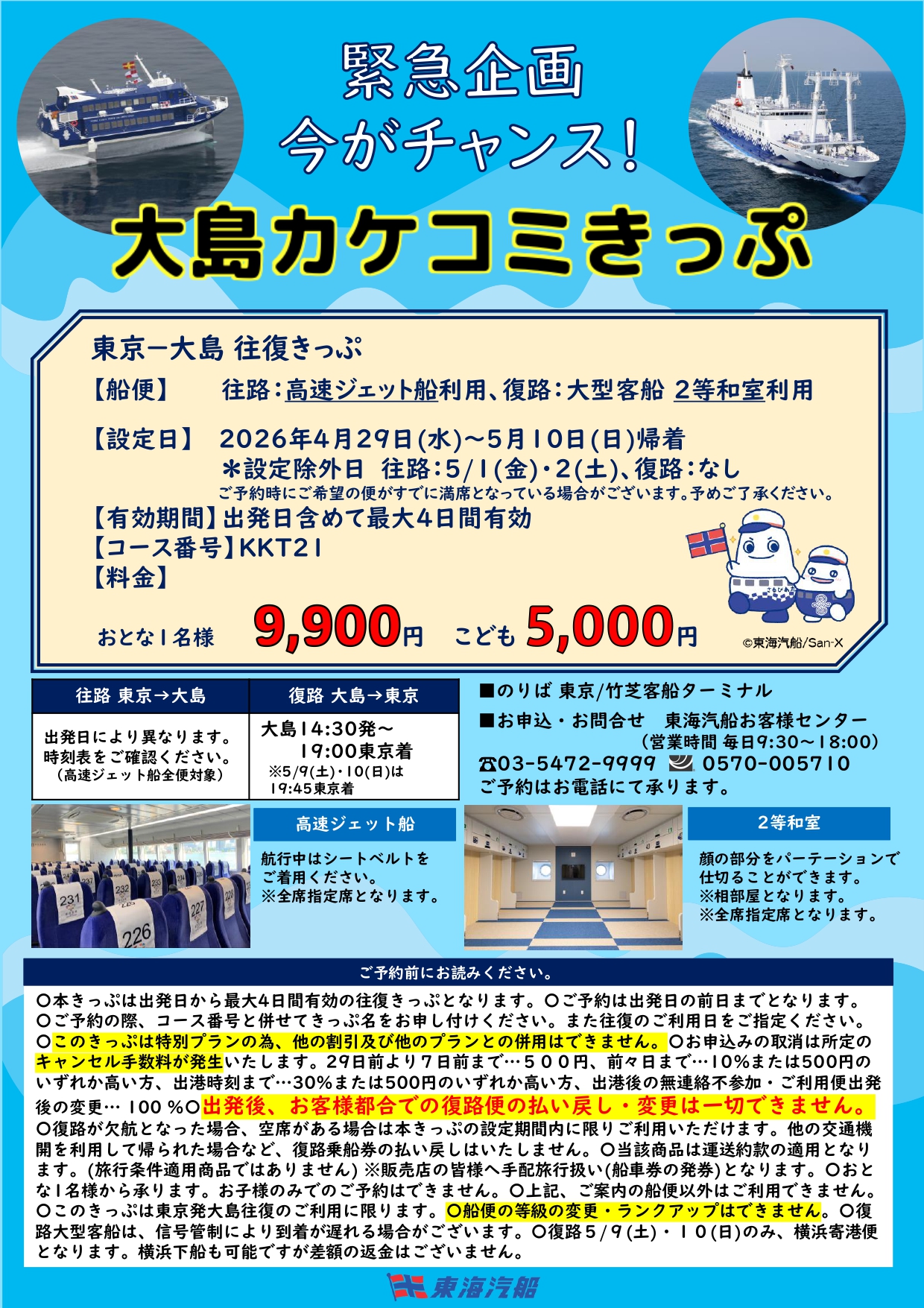 【緊急企画】東京発着「大島カケコミきっぷ」(2026.4/29~5/10帰着)